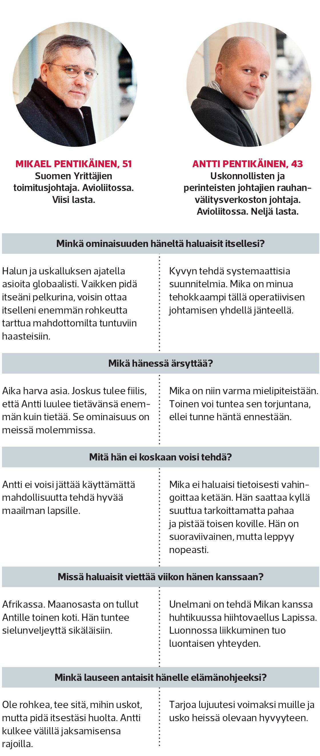 Lapsuus seitsemän sisaruksen parvessa opetti vastuuntuntoa. Lestadiolainen arvomaailma antoi Antti ja Mikael Pentikäiselle turvaa, joka sai kolauksen vanhempien avioeron aikoihin. Maailma on vienyt vaativiin tehtäviin. Kovissa paikoissa veli on paras tuki.