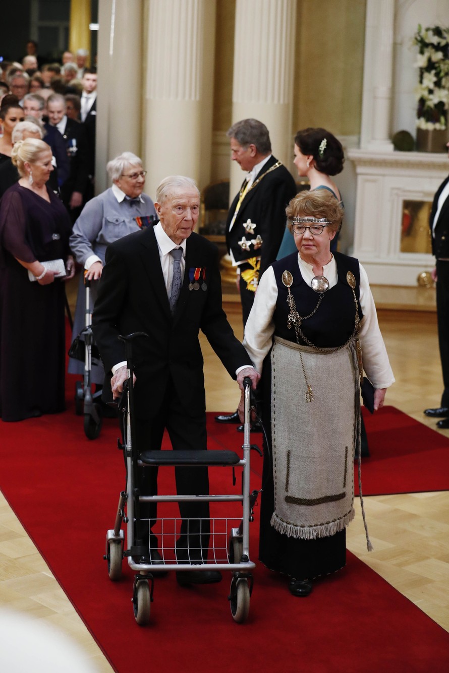 – Presidenttiparin kättelyn jälkeen meidät veteraanit ohjattiin omaan tilaan saliin, jossa presidenttipari kävi tervehtimässä meitä pari kertaa. Tarjoilijat toivat meille huonosti liikkuville koko ajan ruokaa ja juomaa. Lopulta jouduin jo sanomaan ei kiitos! Antti nauraa.
