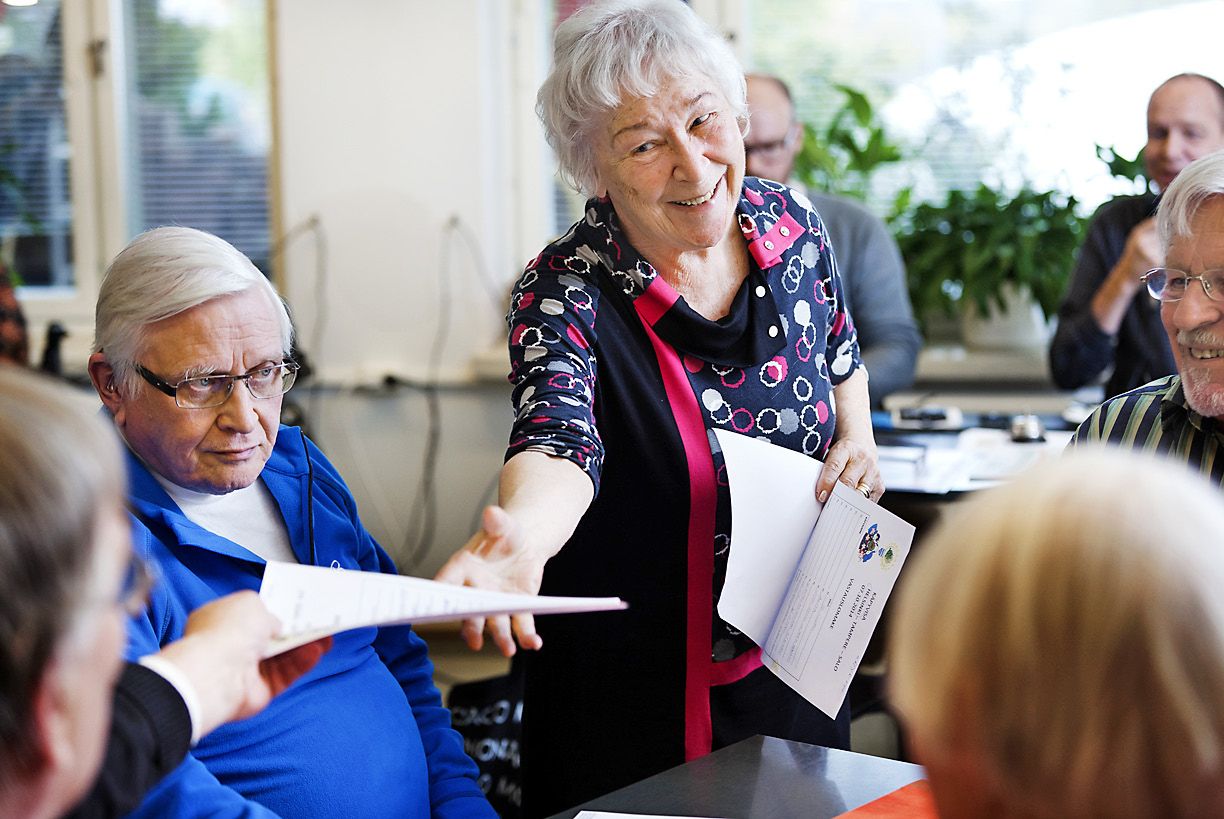 – Meillä on tänään ensimmäistä kertaa läppäri ja videotykki apuna, ja kyllä se tuntuu kätevältä. Ennen jaettiin paperit ja luettiin kysymykset ääneen. Tämä siksi, että osa ei kuule ja osa ei näe hyvin. Kukin kaupunki on tuonut seitsemän kysymystä kisaan. Anneli Eskola jakaa pöytiin laput, joissa kysymykset ovat. Lisäksi ne heijastetaan seinälle ja luetaan vielä ääneen.