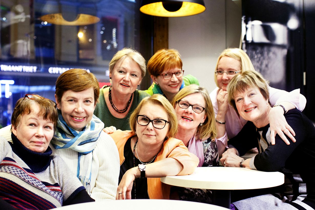 Yhdeksän naisen ystävyys iti työpaikalla. Voimaa saadaan naurusta ja yhteisistä matkoista, kertovat Päivi Kupias, 56, Leena Paananen, 62, Kirsti Hyytiäinen, 64, ja Allu Lamminen, 67. Hyvän työporukan ystävyys kantaa, vaikka eläkevuodet muuttaisivatkin arkista yhteydenpitoa.