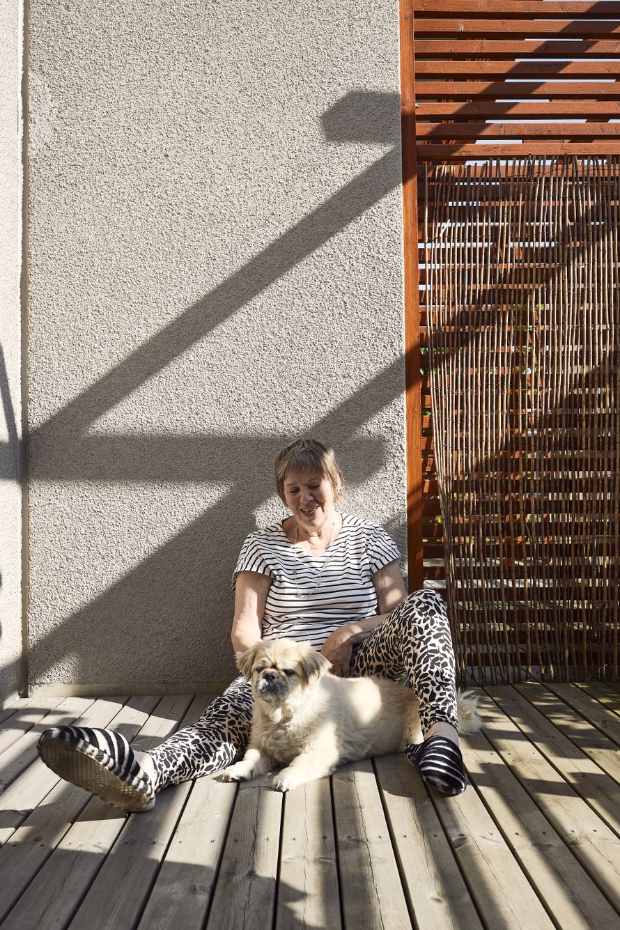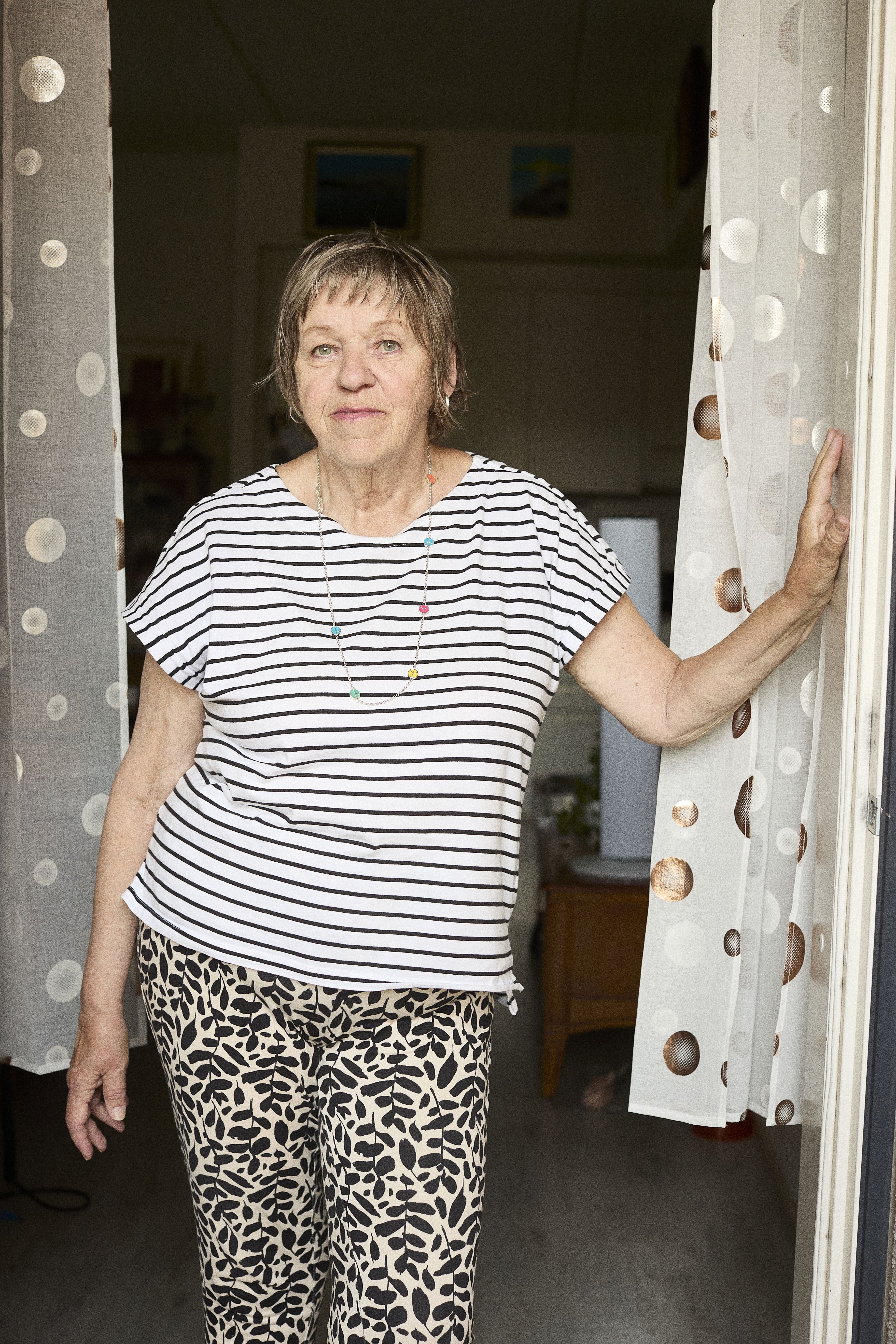 Aamuisin kävelylenkki kulkee päiväkodin ohi. Gitta Oksanen, 71, seisoo jalkakäytävällä, antaa koiran haistella tuttuja pensaita ja katsoo aidan takana leikkiviä lapsia.