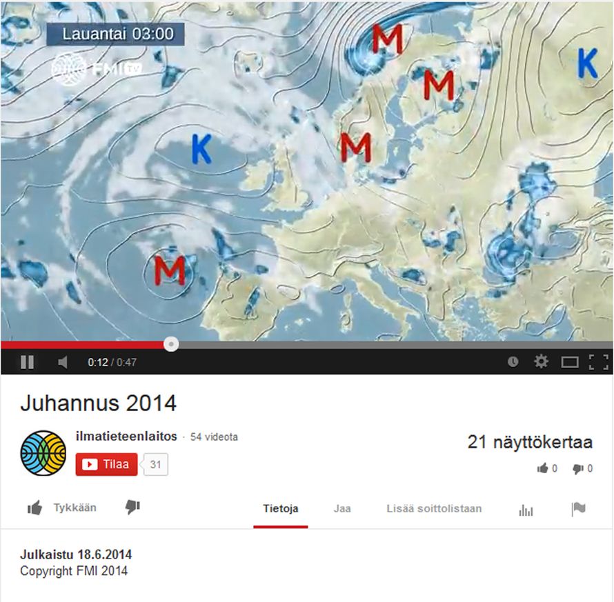Ilmatieteen laitoksen Youtube-tili löytyy täältä: https://www.youtube.com/user/ilmatieteenlaitos/feed