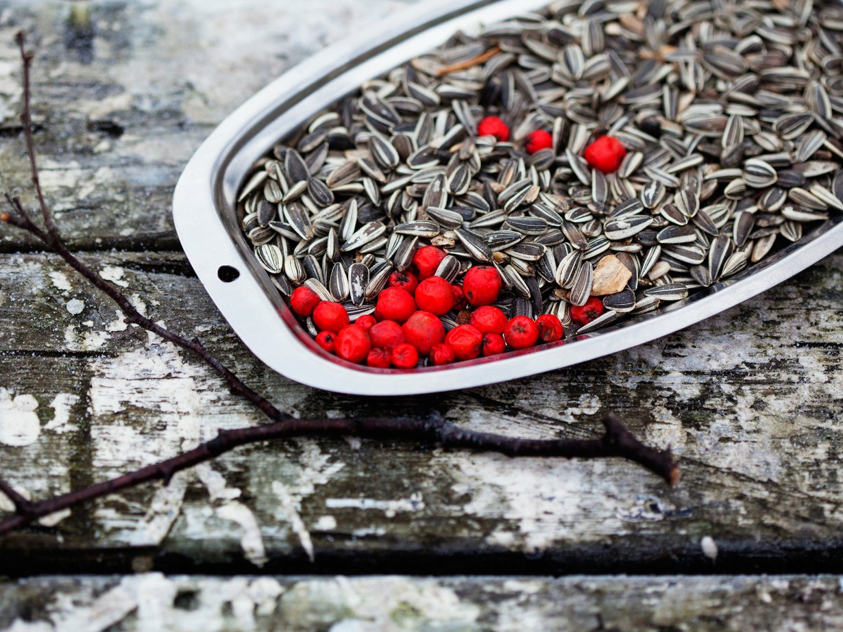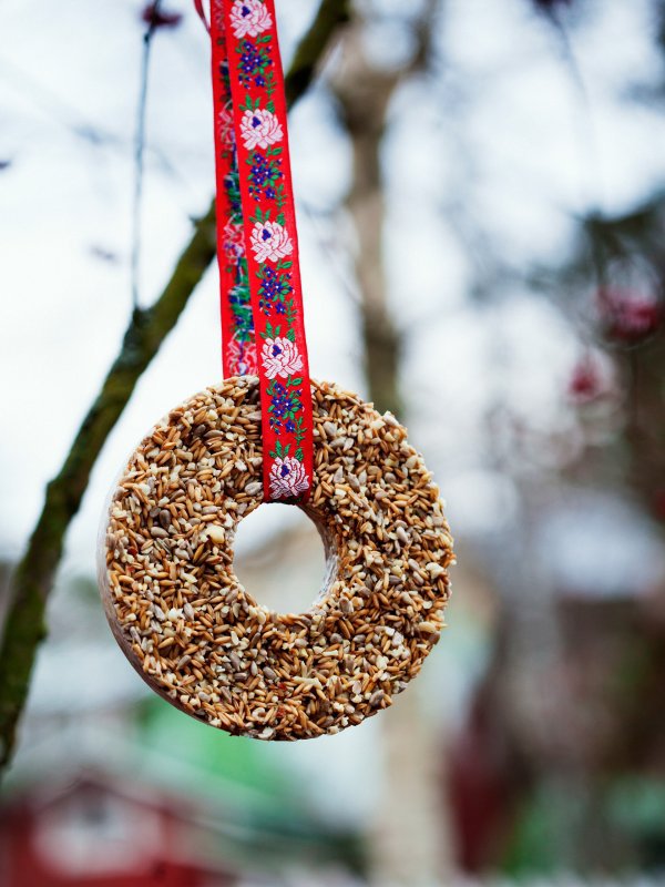 Pihapuussa ruokailevia lintuja on mukava katsella. Tee niille tuhdit sapuskat kookosrasvasta ja siemenistä. Ripusta ne sitten pihapuuhun roikkumaan.
