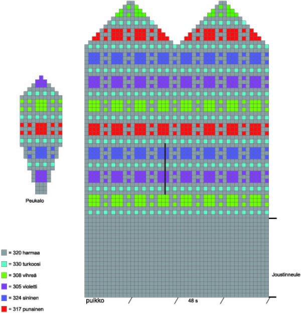 - Peukalo: Ota apulangalta silmukat puikolle, poimi silmukat luotujen silmukoiden reunasta ja peukaloaukon kummastakin päästä (= yht. 22 s). Neulo kirjoneuletta niin, että peukalon keskelle muodostuu yksi ruuturivi pystysuunnassa, muuten tipla-kuvioita. Kun peukalon korkeus on 5 cm, päättele silmukat kuten kämmenosassa.