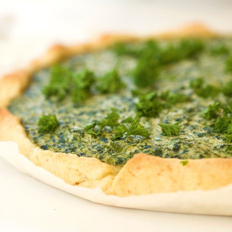 - Kuumenna uuni 200-asteiseksi. Sekoita kylmän veteen jauhot, öljy ja suola tasaiseksi taikinaksi. Painele taikina piirakkavuokaan (halkaisija 23 cm) ja nosta taikinaa myös vuuan reunoille. Esipaista pohjaa 5 minuuttia.