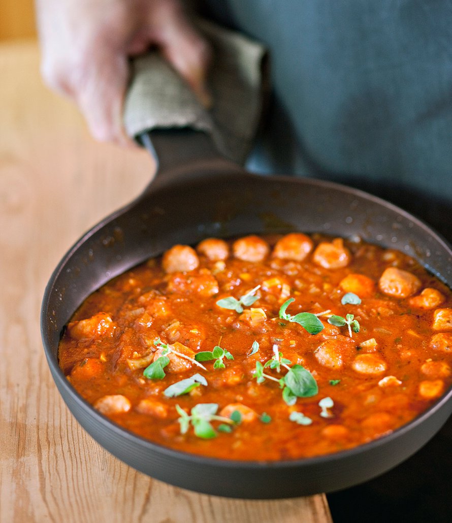 - Kun kastike kiehuu, purista joukkoon siskonmakkarat.
