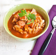Mittaa kattilaan vesi ja tomaattimurska. Kuumenna ja lisää liemikuutiot, suikaloitu kaali, hienonnettu sipuli ja valkosipuli. Hauduta, kunnes kaali on kypsää.