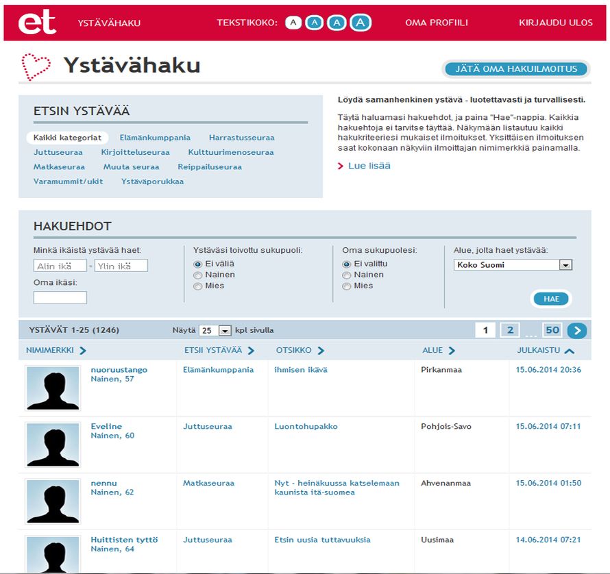 Etsitkö kaveria? ET-lehden ilmainen ystäväpalvelu auttaa, etsitpä sitten elämänkumppania, lenkkikaveria tai ystävää harrastuksiin.