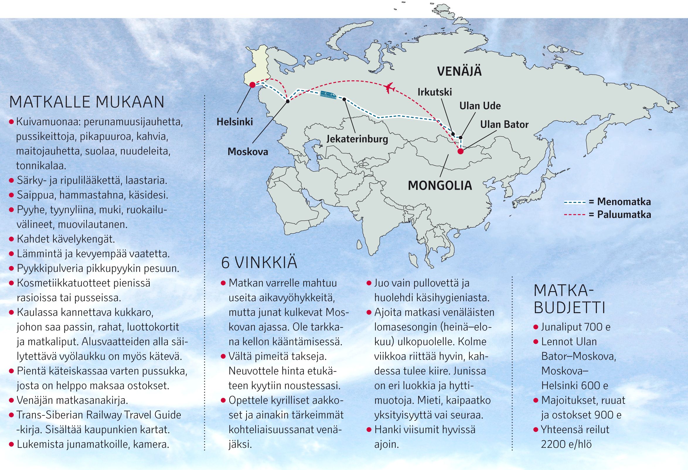 – Jos nyt lähtisimme uudelleen, kävisin venäjän intensiivikurssin. Suosittelen sellaista kaikille junamatkasta haaveileville. Osasimme kohteliaisuussanat, mutta myös kirjaimet olisi syytä hallita, sillä englantia ei puhunut juuri kukaan, Elisabet vinkkaa.