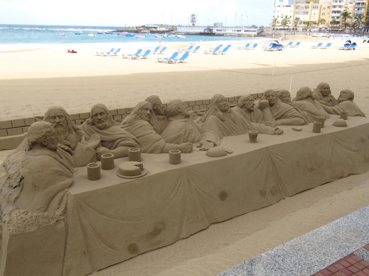 Matkaoppaan kuvakisa: Lähetä kuva erikoisesta hiekasta ja voita Mariskooli! Hiekkaveistos 14.10.2020 klo 18:36 Las Palmasin rantakadun vierellä pääsiäisen aikaan taidokas hiekkaveistos "viimeinen ehtoollinen"
