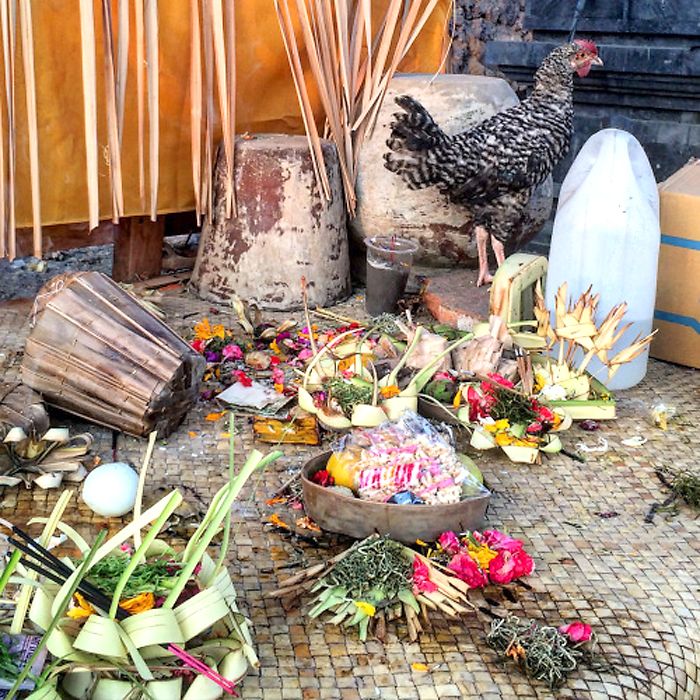 Canang sari. Offering. Tähän pieneen punottuun koriin törmää Balilla joka paikassa: portailla, aidan päädyssä, temppeleissä tietenkin ja ravintoloissa.