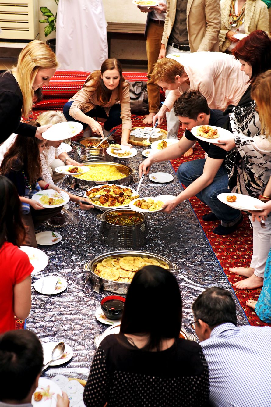 Ensin monikansallinen joukkomme ohjataan kauniiseen pylvässaliin. Perinneasuinen kulttuuriopas Omar kertoo nokkelin sanakääntein ja länsimaisia ennakkoluuloja hauskasti ravistaen arkipäivän islamilaisuudesta. Puolessa tunnissa sekalainen seurakuntamme on kuin yhtä suurta nälkäistä perhettä.