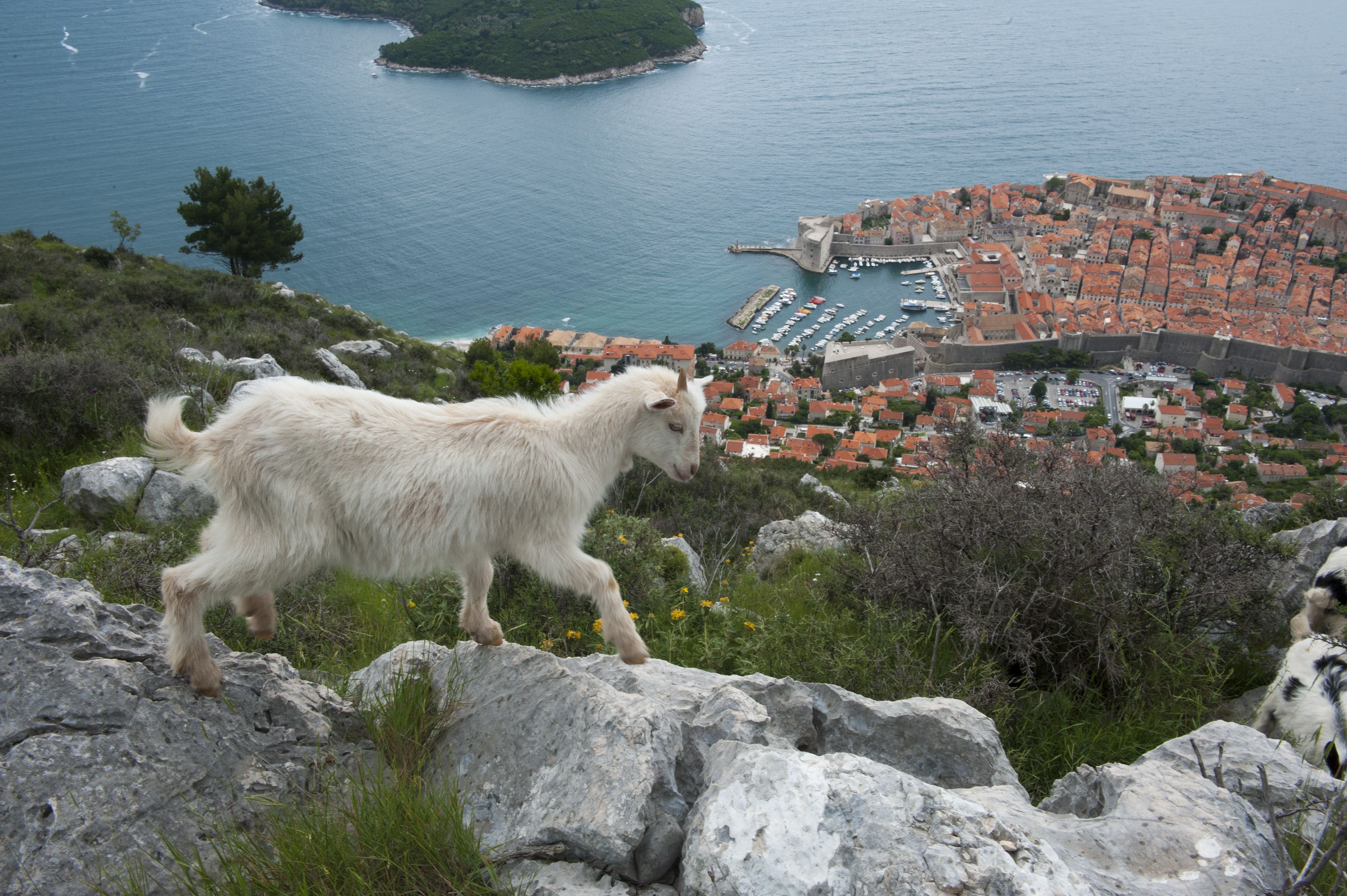 Srd-vuori suojelee kaupunkia. Vuorelle, vuohien ja virtaviivaisten kiitäjälintujen valtakuntaan, noustaan kaapelivaunulla.