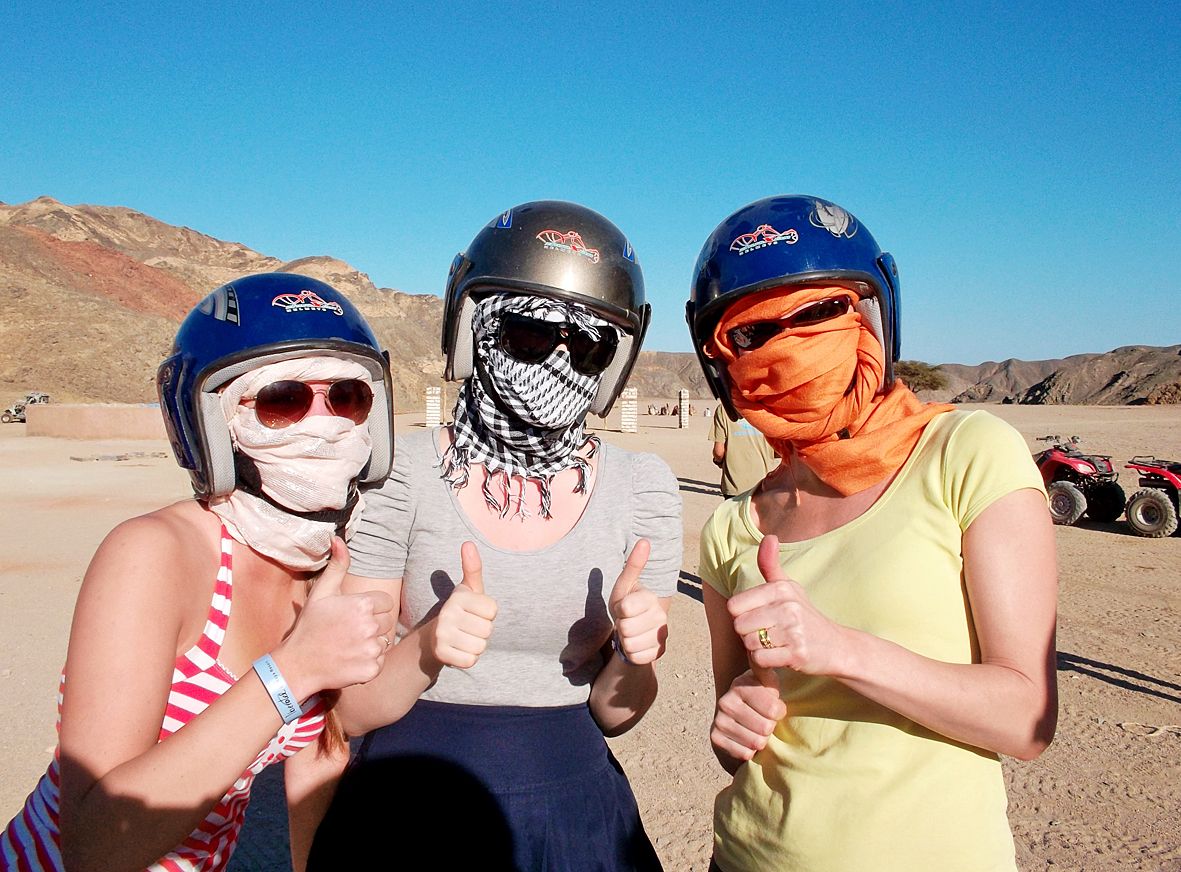 Punaiset mönkijät odottelevat meitä beduiini-kylän laidalla sievästi jonossa. Ennen kuin lähdemme liikkeelle, oppaat kietovat kasvoillemme pölyltä suojaavat huivit.
