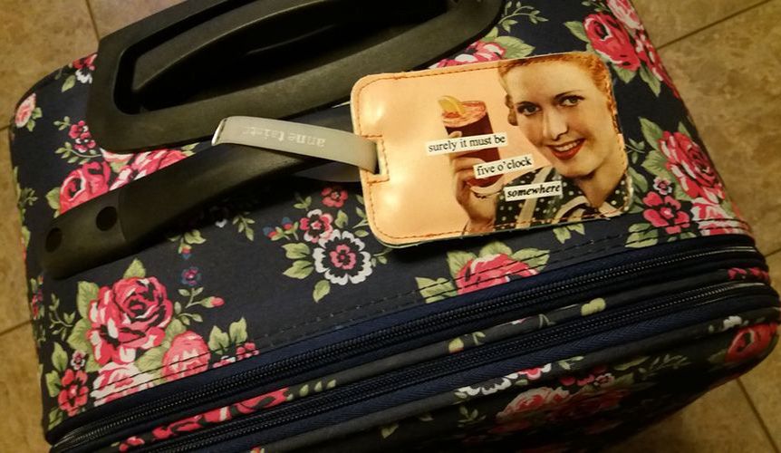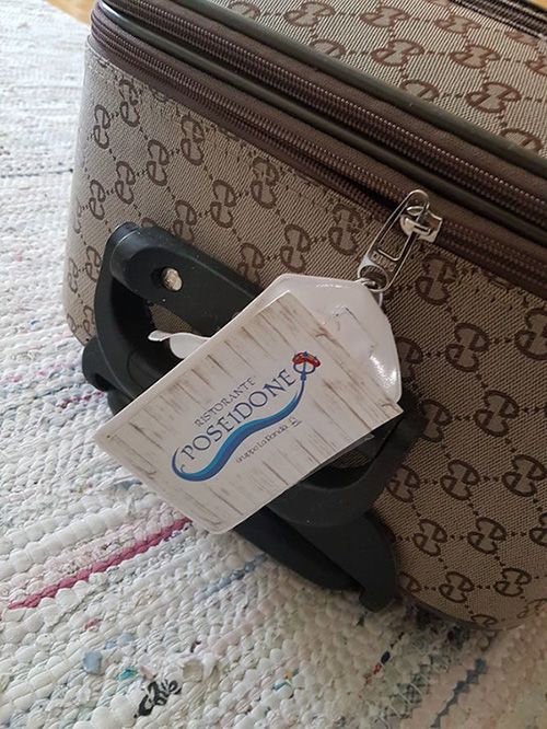 "Matkalaukkuuni ostamani vintage-osoitekortti on mielestäni niin hauska, että olen ostanut näitä pidikkeitä myös tyttärelleni sekä kavereilleni. Erottuu hyvin matkalaukkuhihnalta. Kuten erottuu myös matkalaukku. Erään Dublinin loman viimeisenä päivänä otettiin tyttären kanssa taksi ja haettiin kaupasta 24 euron kukallinen matkalaukku, molemmille samanlaiset, ja taksilla takaisin hotellille. Matkustamme yhdessä siis samanlaisilla laukuilla, mutta pidikkeissä sentään on eri teksti."