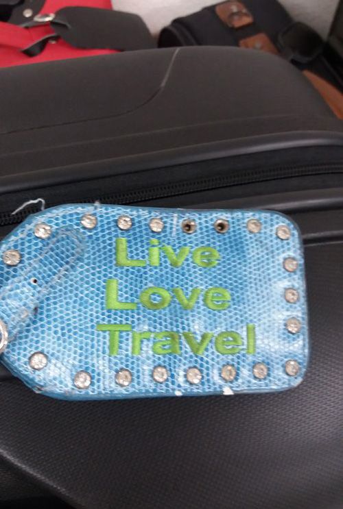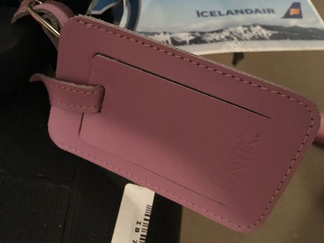 "Siskolta saatu osoitelappu, muistaakseni hän toi sen Kanadasta. Se on käytössä käsimatkatavaralaukussa, kun sointuu täydellisesti sen väriin."