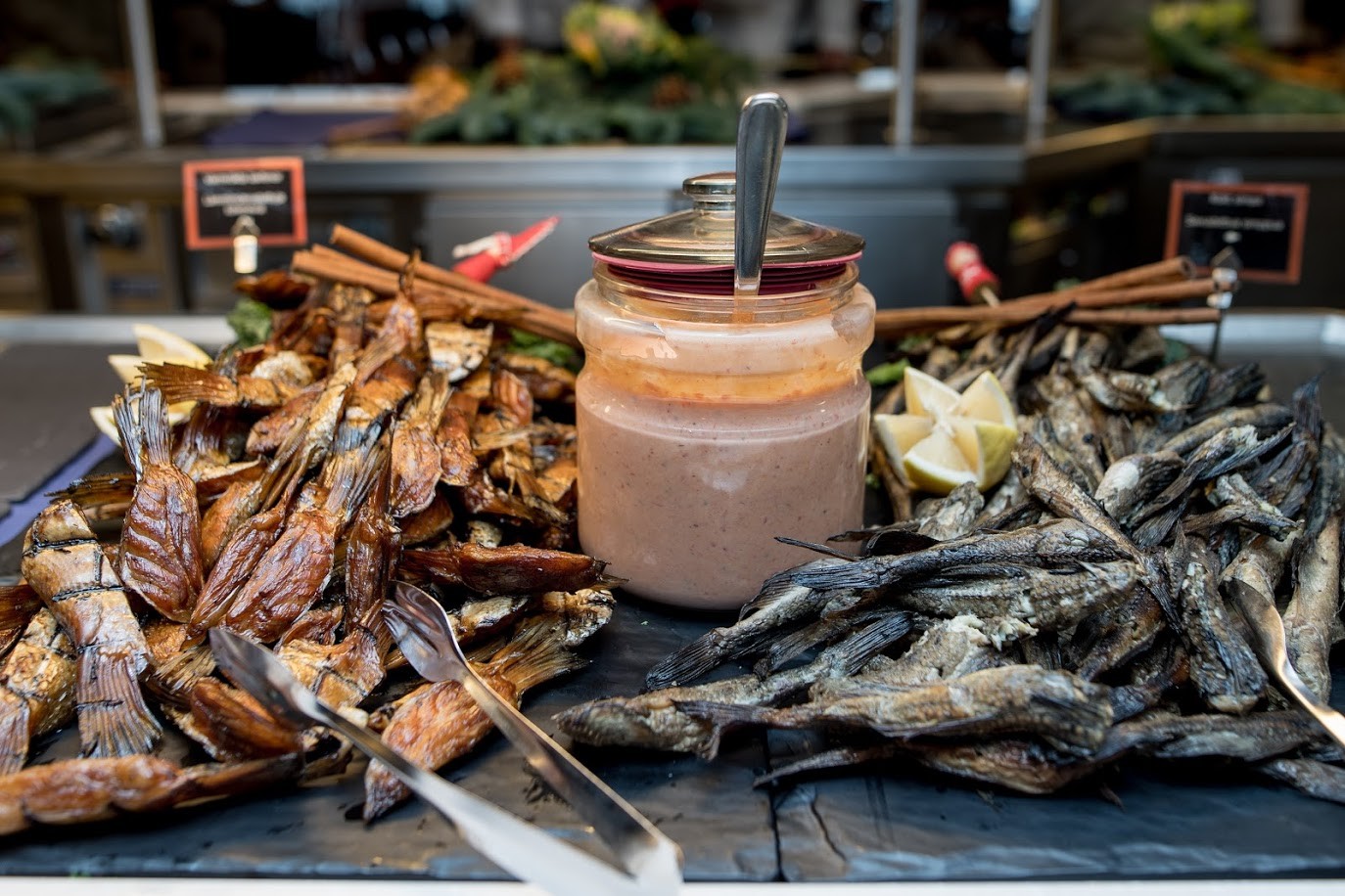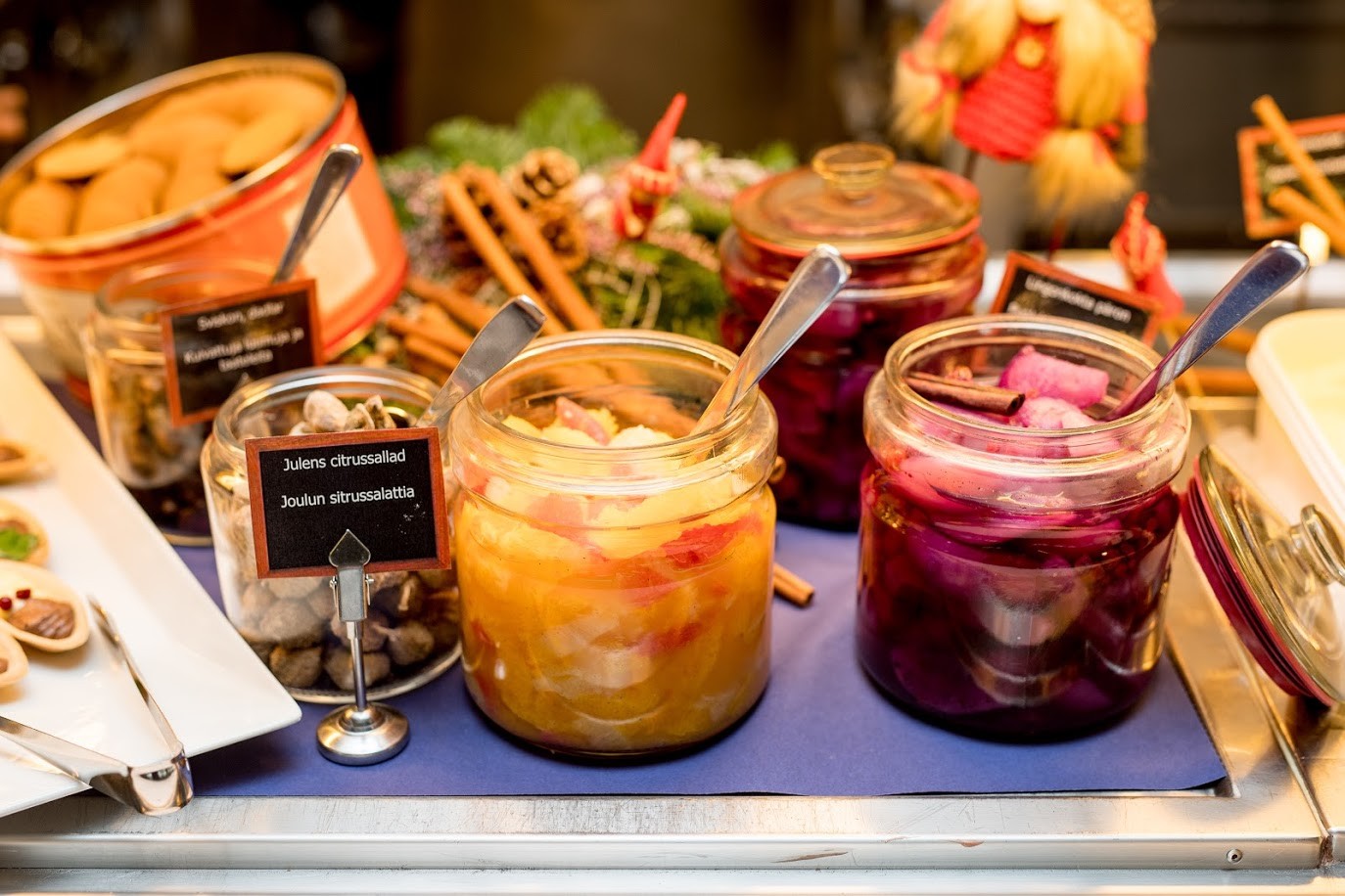 Tarjolla on myös monenlaisia lisukkeita: sinappia, etikkakurkkuja, hillottuja sieniä, omenakompottia, appelsiiniporkkanoita ja paljon muuta. Myös ihana Kalastajan joululimppu ja suolattu voi ansaitsevat erityismaininnan.
