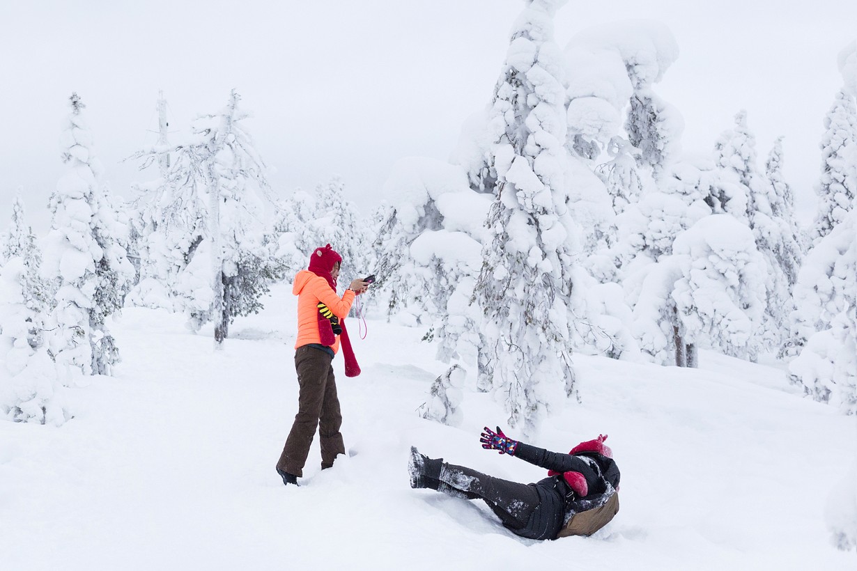 Ounasvaaran laella saa käsityksen, miten laaja on Lapin maa. Huijing Xu ja Yue Yu konttaavat vuoron perään lumessa kuin taaperot. Toinen kuvaa.