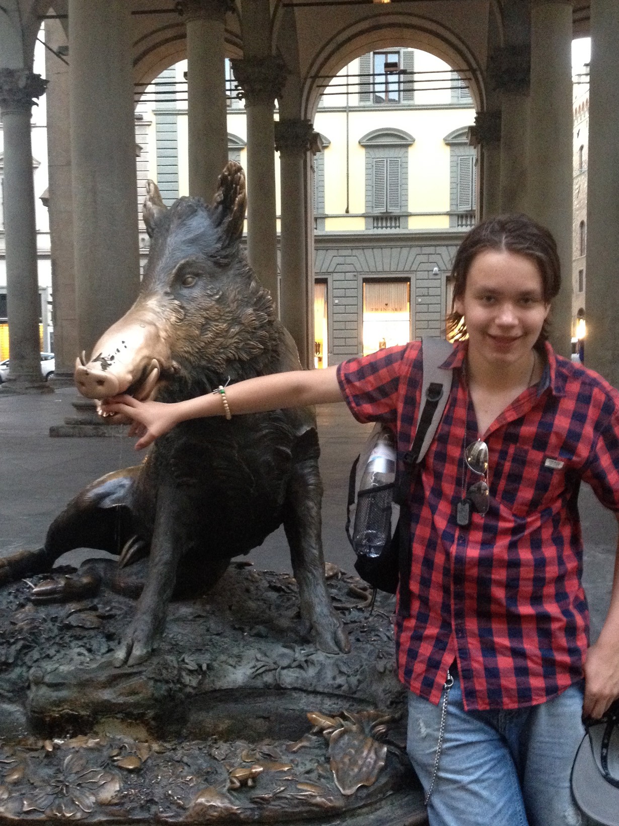 Tämä possu istuskelee torilla Via Calimalan varressa. Possu on niin kuuluisa, että sen vieressä on pitkä jono ihmisiä: kaikki haluavat possun kanssa yhteiskuvan. Niin minäkin.