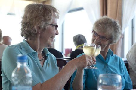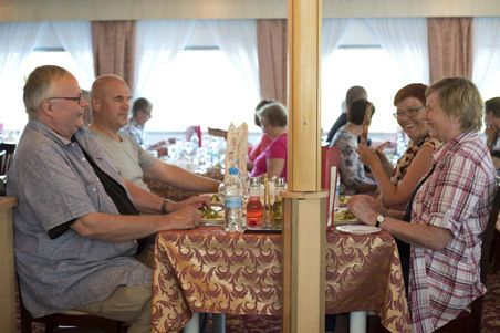 Laivalla ruokailtiin koko viikko samassa seurueessa.Edessä sisarukset Seppo Törrönen ja Marja-Liisa Myller. Takana aviopari Kirsi ja Markku Ristola.