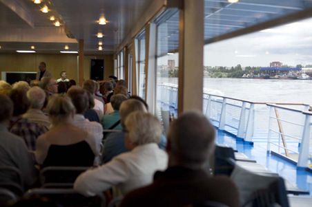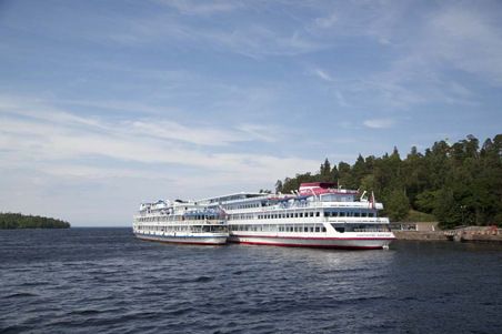 Risteilyn satamissa parhaimmillaan neljä laivaa pysähtyi vierekkäin ja ulommasta kuljettiin satamaan kaikkien läpi. Tämä siksi, että syviä satamakohtia ei ole paljoa. Iso laiva on Konstantin Korotkov, eli ET-risteilyn laiva.