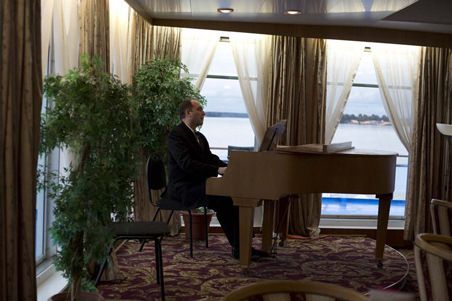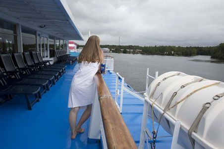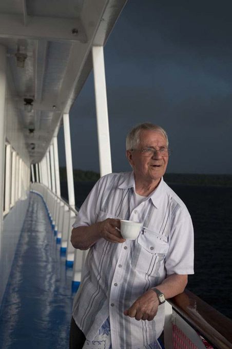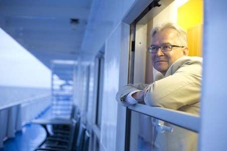 Uskontotieteilijä Risto Aikonen ihailee maisemia hyttinsä ikkunasta. Hän on ollut neljänä kesänä luennoimassa risteilyllä.Valamon turismi alkoi 20 vuotta sitten. Monet, joilla on juuria tänne ovat jo käyneet. Nuorempia ei kiinnosta, vaikka reissuhan on aivan upea kaikenikäisille.