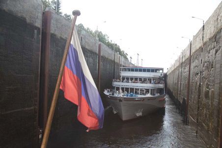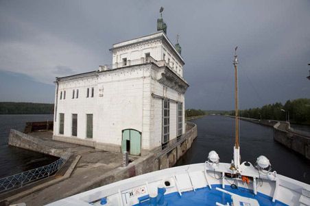 Svirstoin voimalaitos nostaa sulun läpi itään kulkevia laivoja 12 metriä ylemmäs.