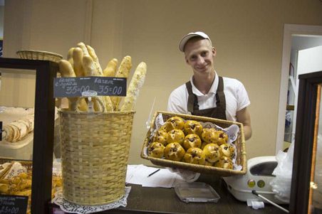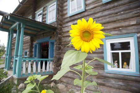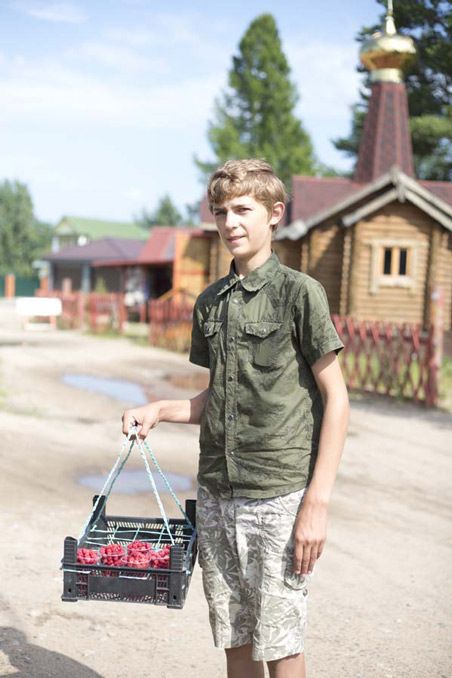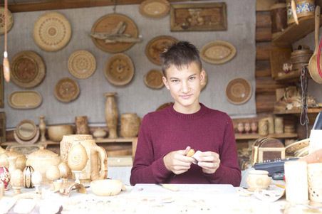 Ales myy isänsä tekemiä taidokkaita tuohitöitä Syvärillä. Ales tekee niitä myös itse. Isä ja äiti työskentelevät Mandrogin perinnekylässä tuohitöiden parissa.