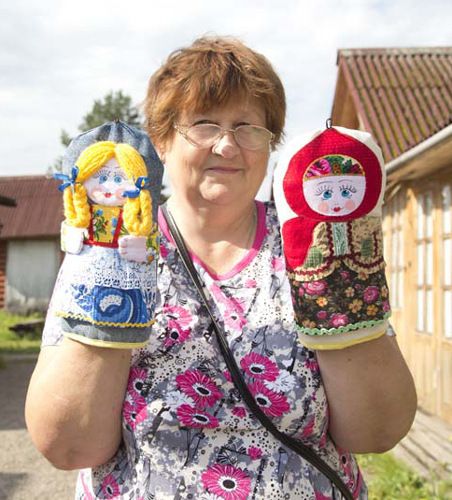 Irina Lapushkina myi Syvärin kylässä käsitöitään, mm. hauskoja patahanskoja