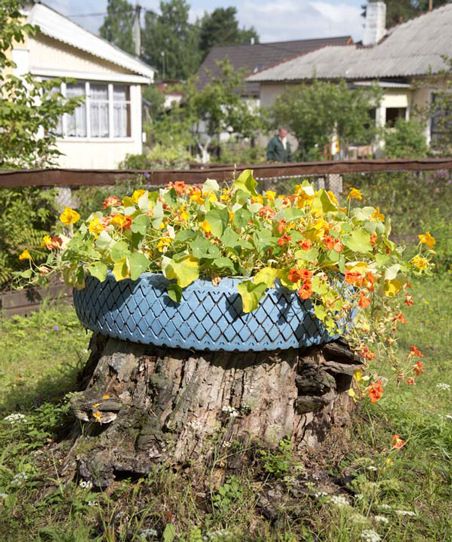 Traktorinrenkaasta on tehty hauska kukkaruukku.