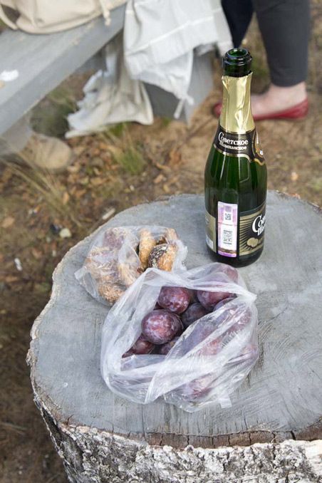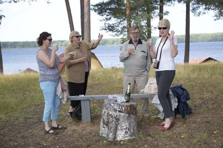 Syvärin kylän raitilla juhlittiin Elina Tulonen-Lustigin 60-vuotispäiviä, ja kannon nokkaan oli katettu kuohuviiniä, luumuja ja sipulipiiraita. Juomana oli ”Suhosen Paulia” eli pol suhoje alias venäläistä puolikuivaa kuohuviiniä.