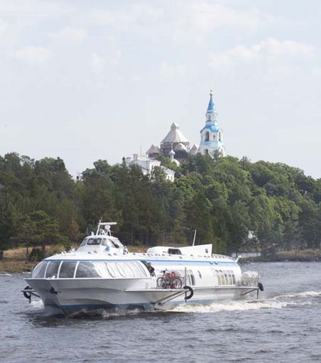 Valamon pääluostariin mentiin pienellä kantosiipialukselle. Isot laivan eivät mahdu satamaan.
