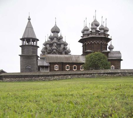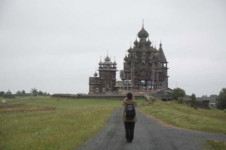 Tunnelmia Kižin museosaarelta. Kižin ytimenä ovat Kristuksen kirkastumisen ja Jumalansynnyttäjän suojeluksen kirkot sekä niiden kellotorni. Täyspuinen Kristuksen kirkastuksen kirkko on rakennettu 1714. Sen 22 haapapaanuista kupolia loistavat hopeisina, eikä kirkkoon ole käytetty ainuttakaan rautanaulaa. Alun perin se rakennettiin kesäkirkoksi. Kirkko on ollut turisteilta suljettu vuodesta 1980.