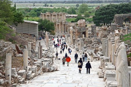 Efesoksen pitkällä pääkadulla oli vilskettä jo ennen ajanlaskumme alkua. Entisen suuren satamakaupungin kaduilla on läpi historian nähty ihmisiä maailman kaikilta kolkilta. Niin nykyäänkin.