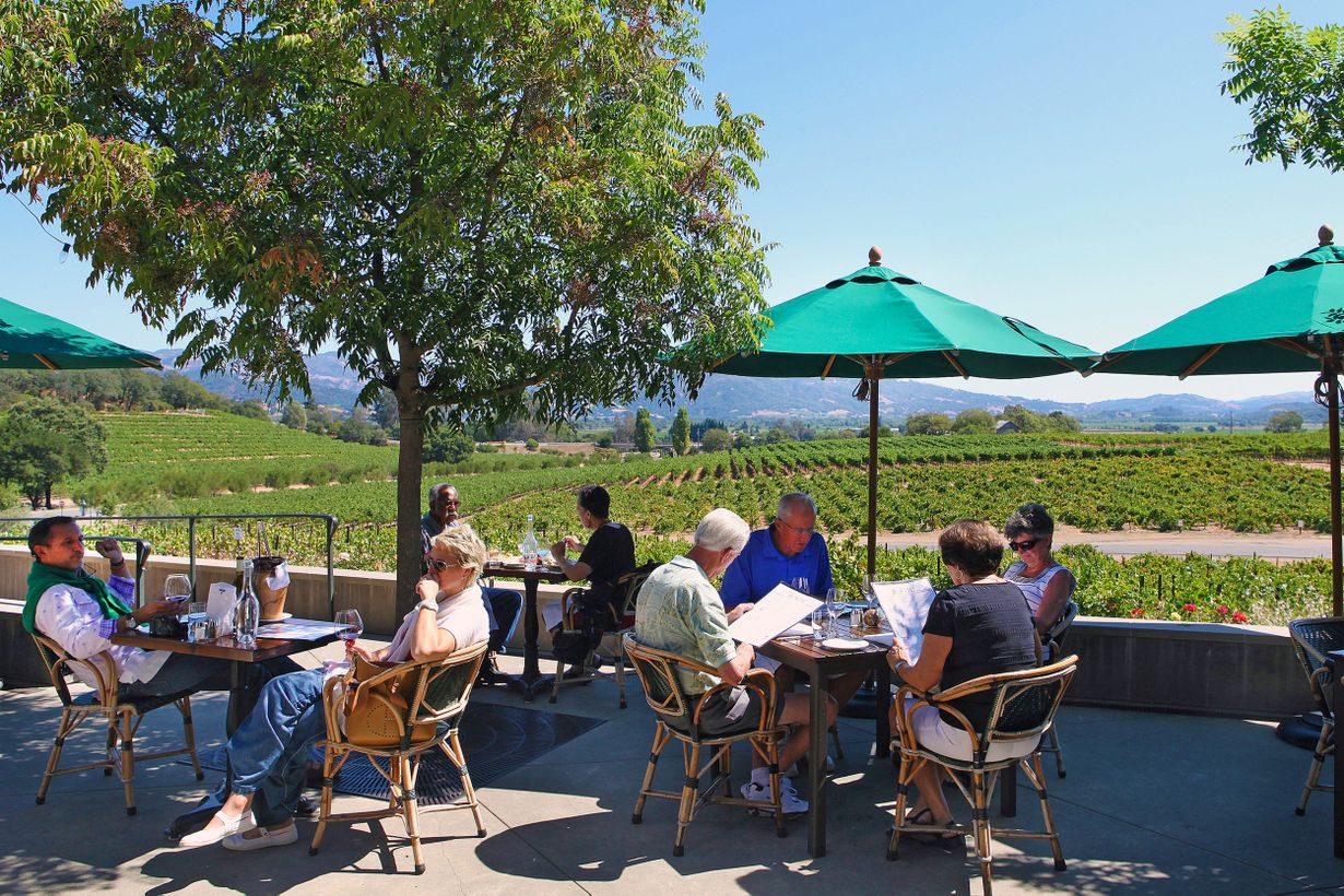 Viereisessä pöydässä lauletaan syntymäpäiväsankarille. Ravintolaan saapuu paljon lähistölläkin asuvia juhlimaan hyvän ruoan ja viinin merkeissä. Suojaisalle terassille on tunkua, kun Kalifornian aurinko antaa parastaan.
