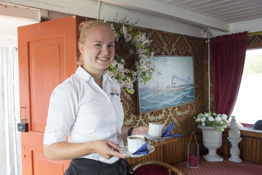 Risteilyllä kahvi maistuu. Viime vuonna s/s Punkaharjulla kahvia tarjoili Ella Alanen.