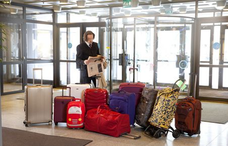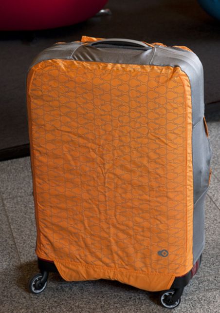 Matkalaukun suojapussi suojaa pintaa ja sen avulla on helppo erottaa oma laukkunsa. Oranssi Samsonite-pussi on Beliziasta.