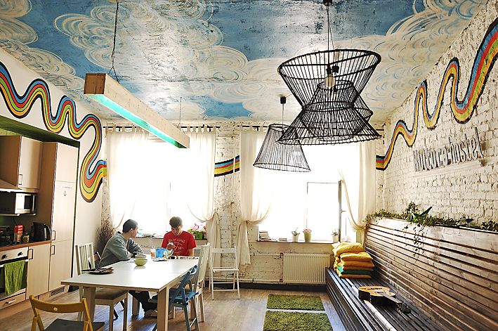 Sympaattinen hostelli (kuvassa yllä) taiteen täyttämällä sisäpihalla, jossa design-kauppa, viinibaari, galleria ja hampurilaisravintola. Jokaisessa huoneessa uniikki seinämaalaus. Suihkut ja vessat konteissa käytävällä. Huone kahdelle alkaen 35 €. Ulitsa Vosstanija 24. Metro: Ploschad Vosstania. www.kulturahostel.com - Hostel Mir