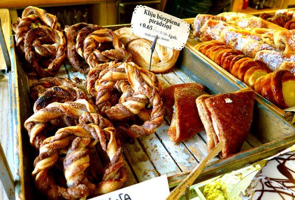 Tuoksuva leipomo-kahvila, hyllyt pursuavat vastaleivottuja leipiä, pullia ja piiraita. Tirgoņu iela 8.