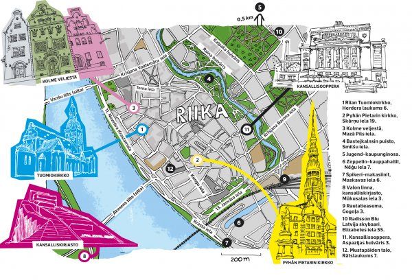 - 800 vuotta vanhan Riian silhuetin muodostavat vanhankaupungin kirkot ja goottilaiset tornit. Jo pelkkä kävely nupukivikaduilla ja aukioilla on kiva elämys. Vaurauden vanhaan Riikaan toivat hansakauppiaat, kauneudesta huolehtivat eurooppalaiset taiteen mestarit. Asuintaloista iäkkäin on 1400-luvulta: osa kolmen veljen taloryhmää Mazā Pils -kadulla.