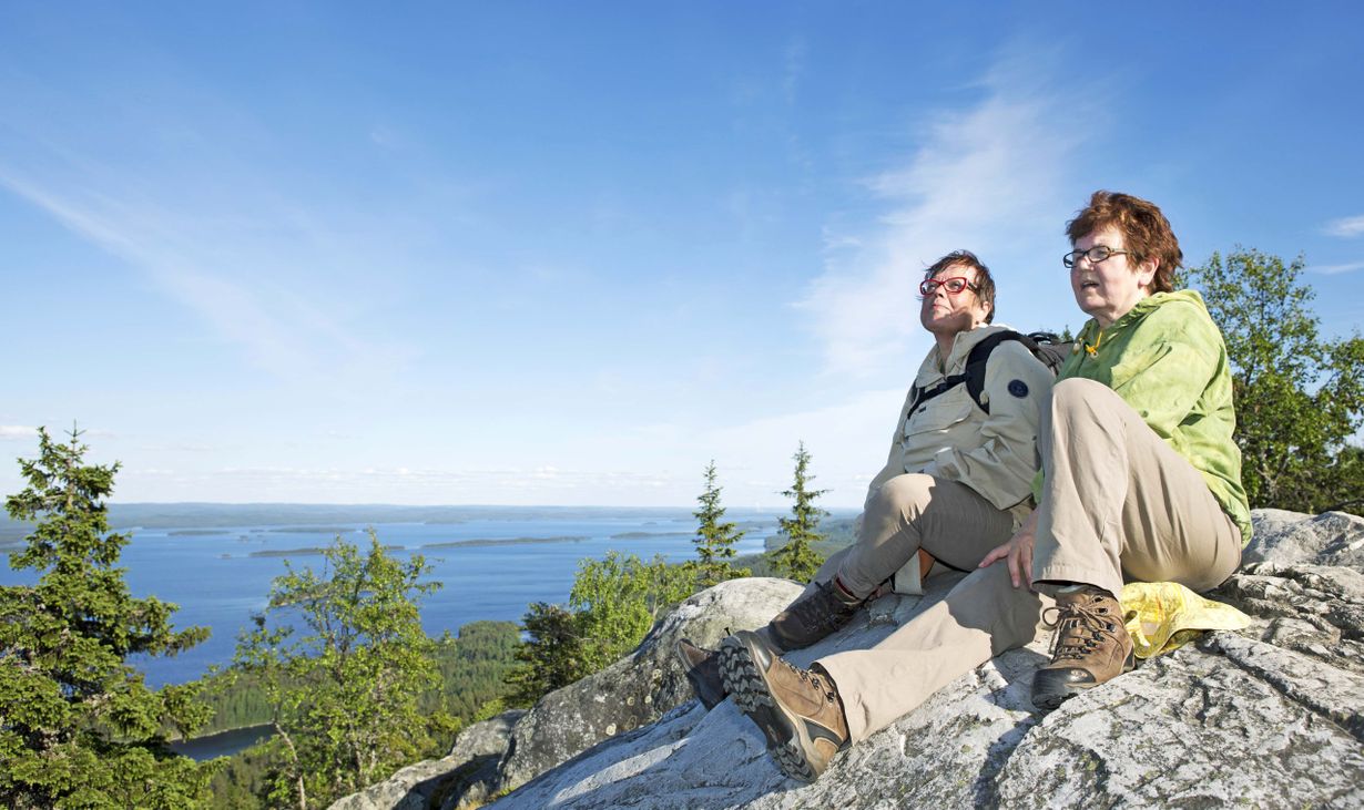 Leena Kangasaho, 64, ja Kirsti Hassinen, 65, entiset kollegat, seisovat Ukko-Kolin huipulla ja ihailevat yli Pielisen avautuvaa, Suomen tunnetuinta kansallismaisemaa.
