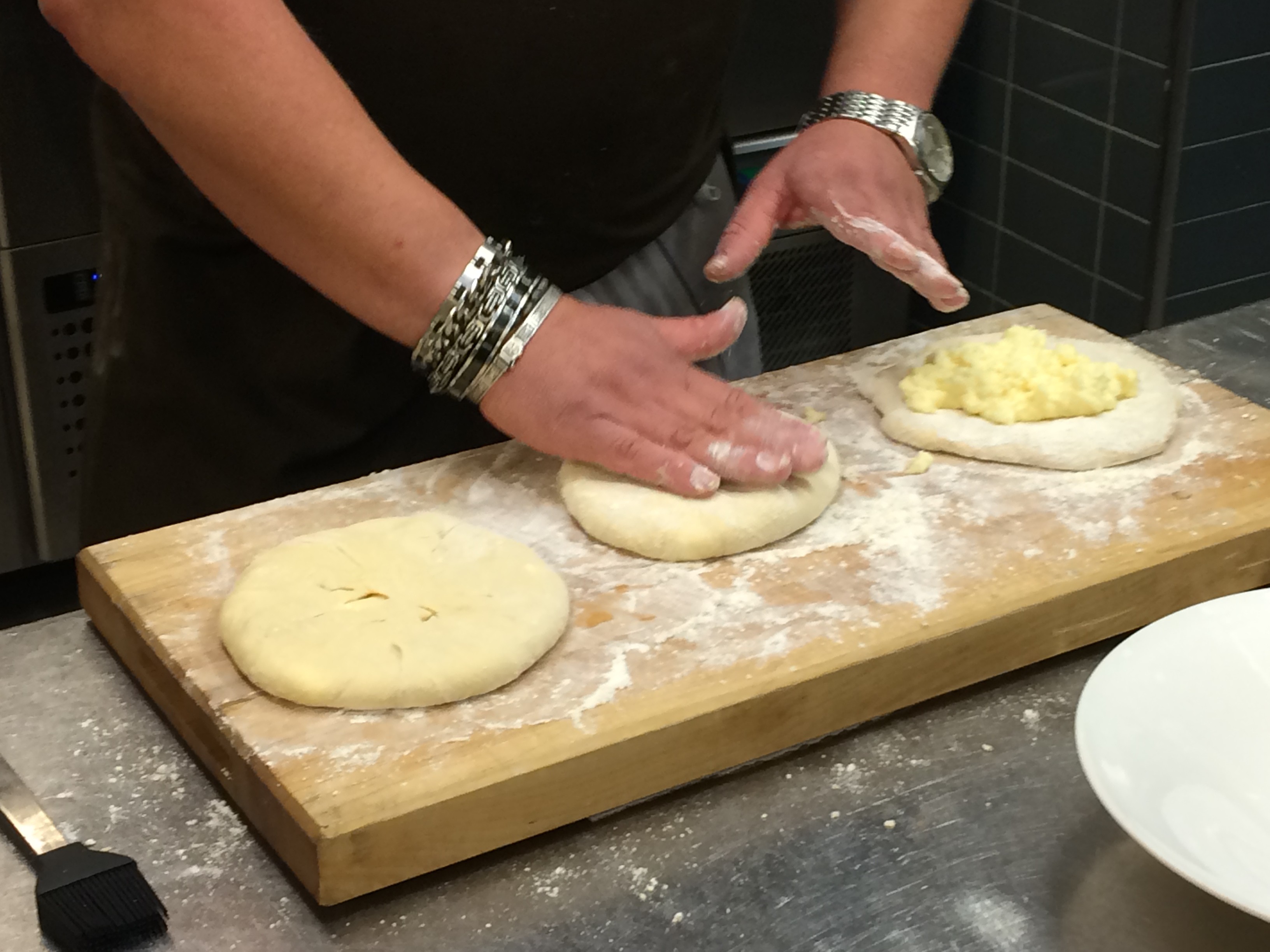 Haapasalo taputtelee taikinakiekot litteiksi, kokoaa päälle kasan juustoa ja rypyttää nyytiksi. Sitten hän painelee nyytit paksuhkoiksi leipäsiksi ja voitelee munalla. Nilosaari nostaa ne uuniin paistumaan.