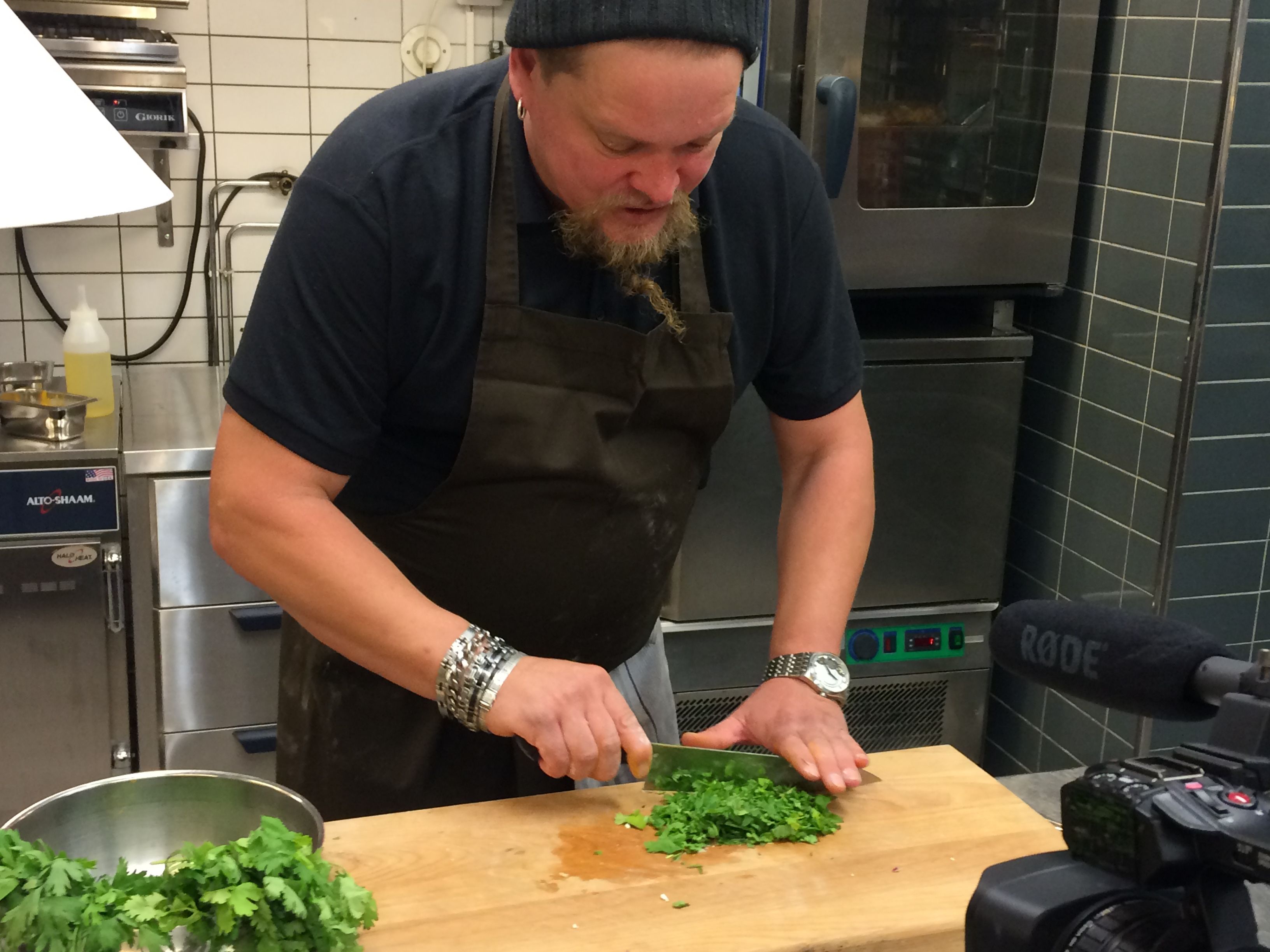 Vielä on jäljellä georgialainen salaatti, jonka ainekset odottavat tiskillä teräskulhoissa: kurkkua, tomaattia, punasipulia, lehtiselleriä, vähän valkosipulia, chilä. Haapasalo aloittaa ainesten huolellisen pilkkomisen.