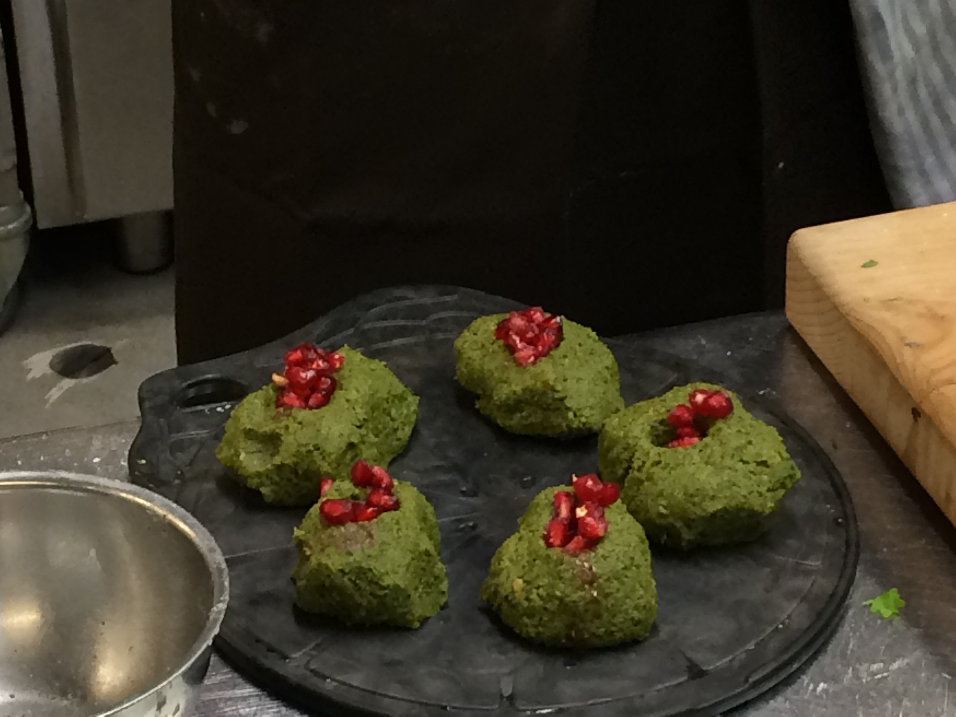 Haapasalo kaivaa kylmäkaapista kasvismuhennokselta näyttävää vihertävää phaalia. Siitä hän pyörittelee palleroita, joita kutsuu "rutistetuiksi pingispalloiksi".