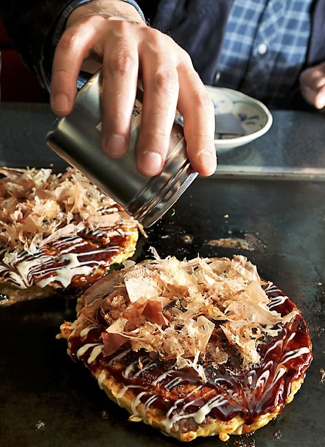 Japanilaiseksi pizzaksi kutsuttu okonomiyaki on pyttipannun, räiskäleen ja munakkaan risteytys.