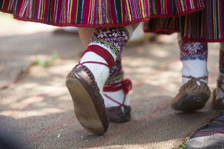 Kihnun pukuun kuuluvat paksut pitkät villasukat ja nahkalipokkaat.