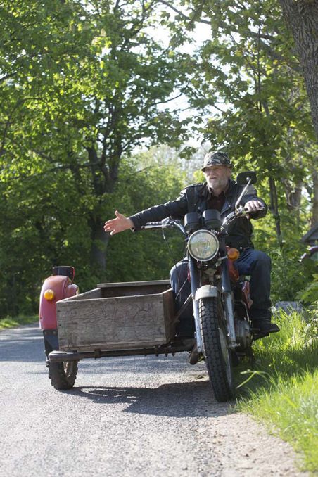 Ülo Laine kaartaa pihaan sivuvaunuprätkällä. Hän nauraa itsellään olevan päällä ”Kihnu mies mood, parta ajamatta”.