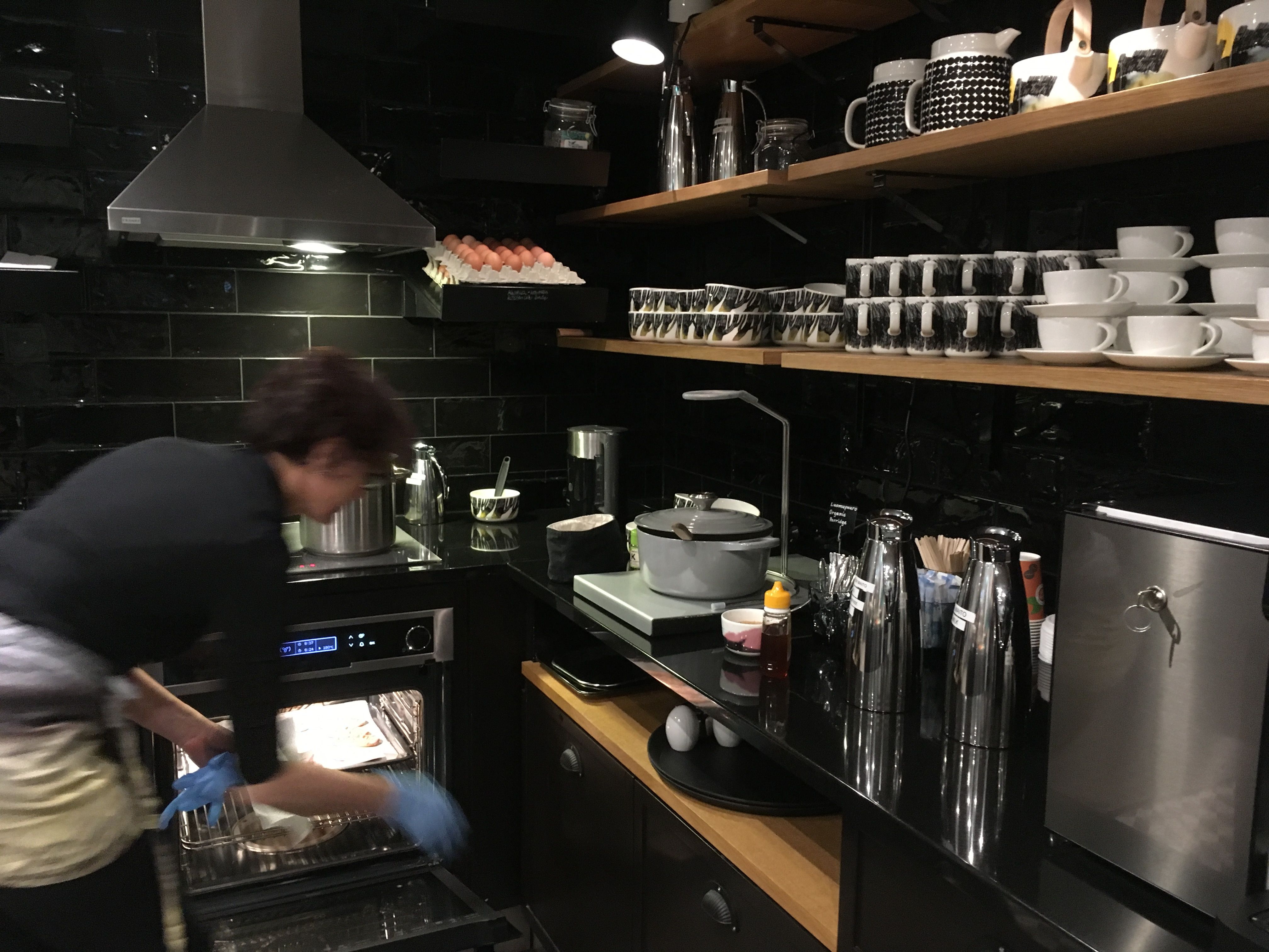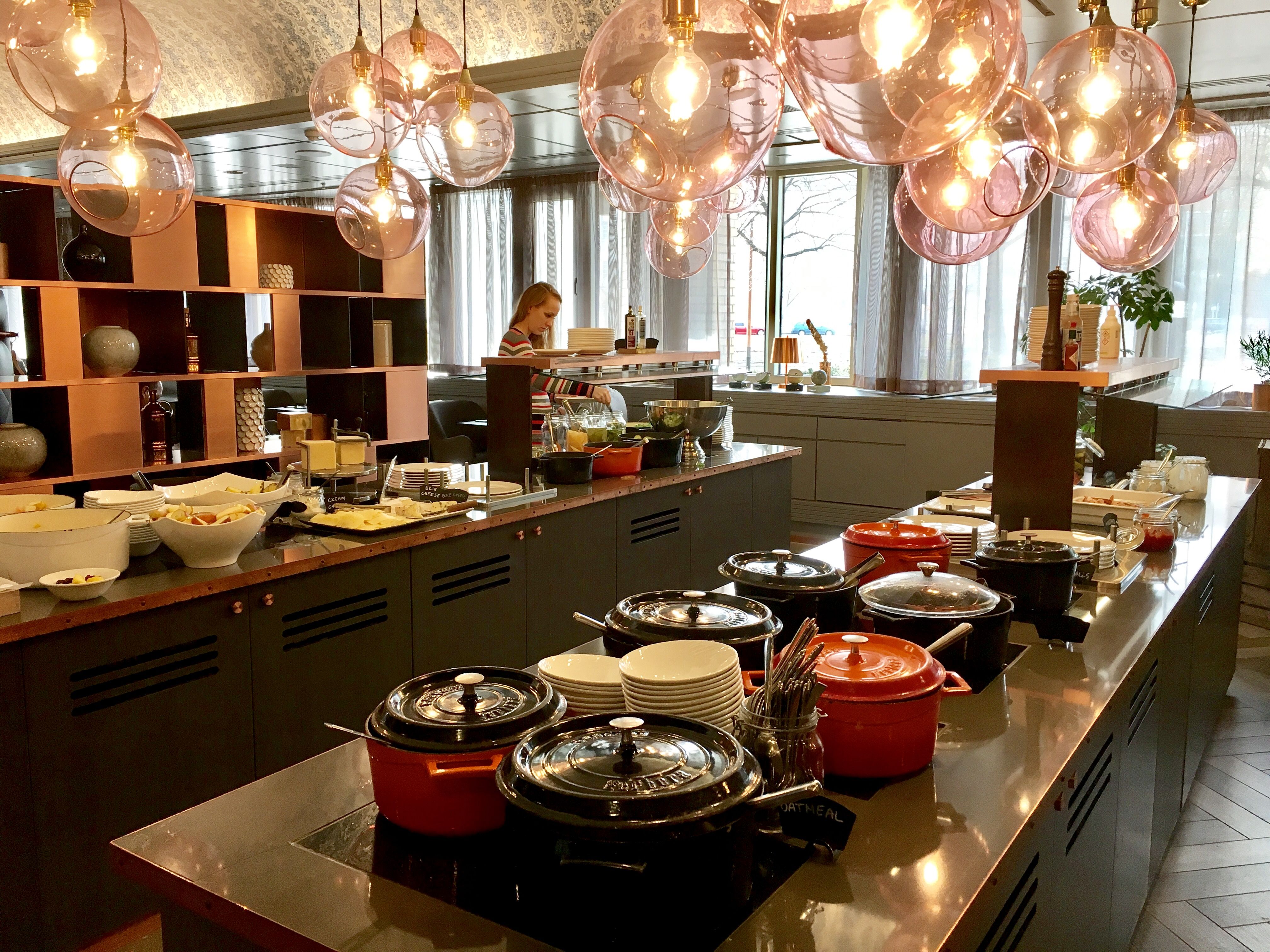 Aamiainen: Kahvi tai tee sekä tuoremehu tarjoillaan pöytään, erikoiskahveja saa automaatista. Pyytämällä pöytään voi tilata myös munakkaan ja pannukakkuja. Tilasimme tietysti molempia! Kansainvälisten vieraiden huomioiminen näkyy aamiaistarjonnassa, sillä munien, nakkien ja pekonien lisäksi tarjolla on keitettyjä uusia perunoita ja nuudeleita. Tarjollepanoa on mietitty: lämpimät ruuat tarjoillaan Le Creusetin klassikkopadoista, maidot lasipulloista.