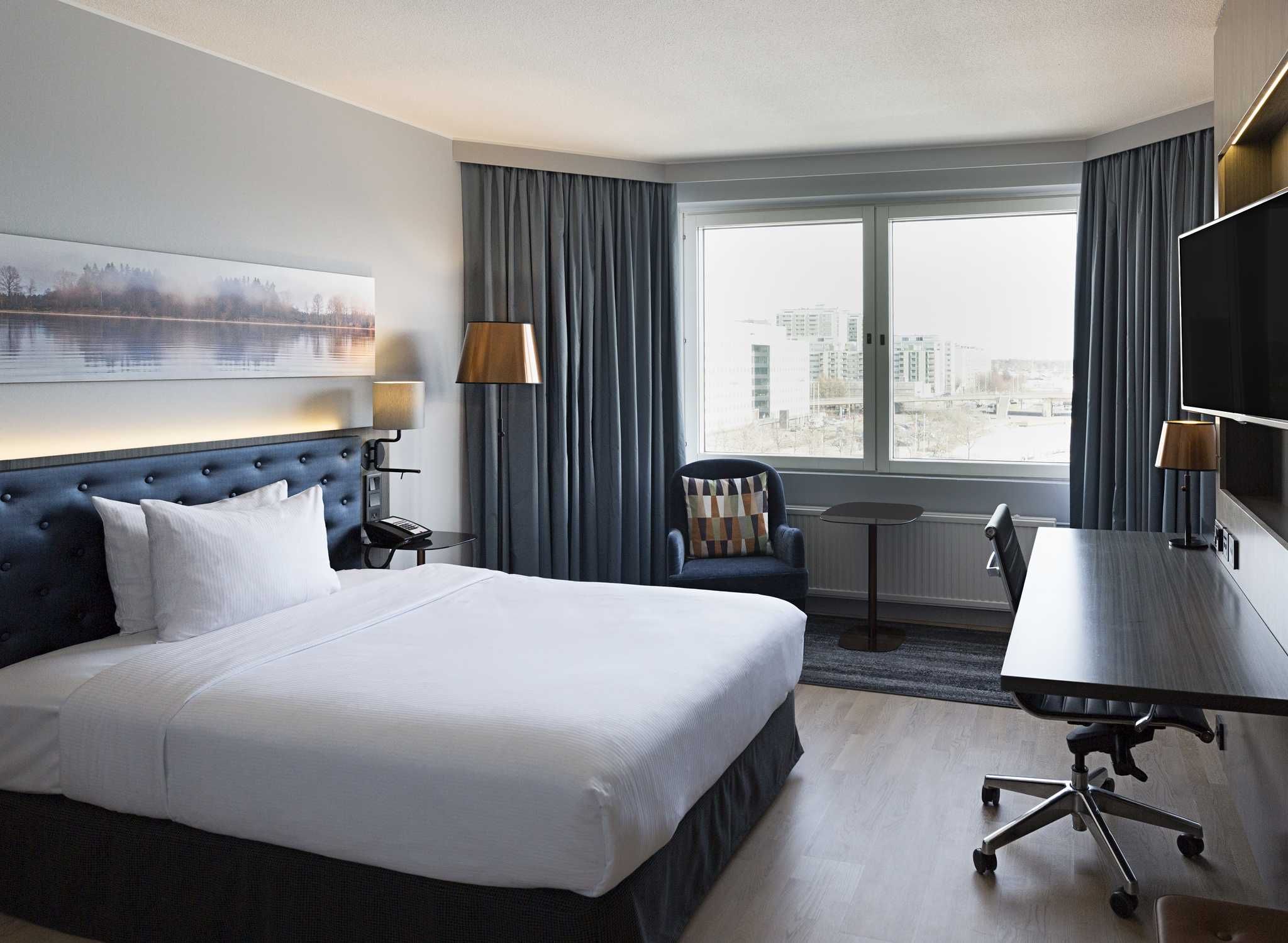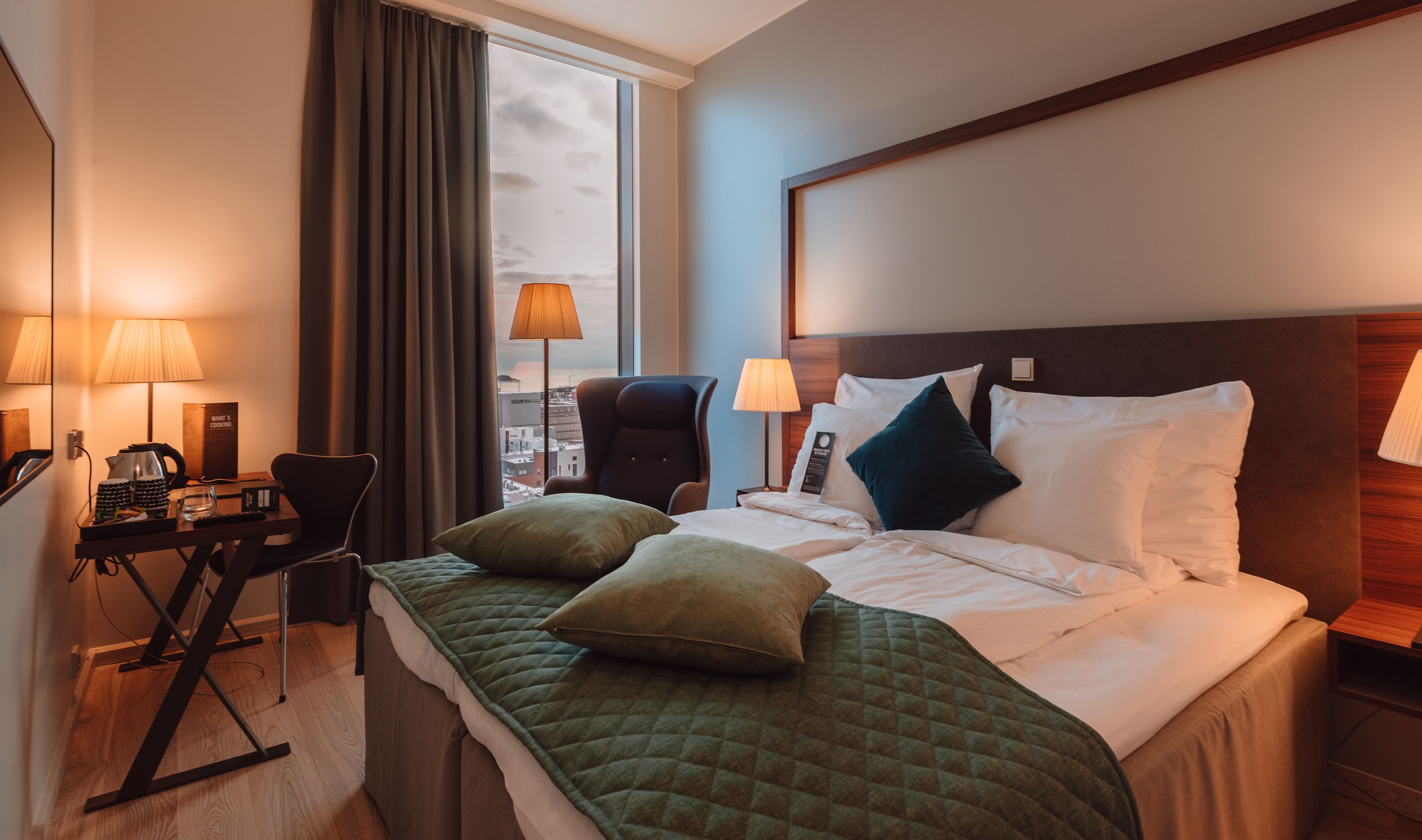 Yövymme 10. kerroksen Superior-huoneessa, josta on korkea, kapea, ikkunat Helsingin keskustaan päin. Superior on pikkuisen isompi kuin Standard-huone, mutta tuntuu silti yllättävän pieneltä. Tarjolla on myös sviittejä, jotka löytyvät hotellin ylimmästä kerroksesta.