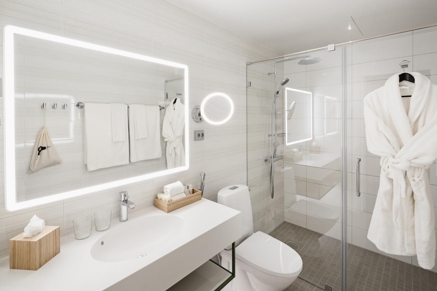 Fiksu yksityiskohta kylpyhuoneessa on silmille lempeä yövalaistus. Suihkut pesevät ja hierovat. Kylpyhuonetuotteina on laadukkaan tuntuiset shampoo, hoitoaine, suihkugeeli, kosteusvoide sekä pumpulia, vanupuikkoja, kynsiviila ja suihkumyssy.